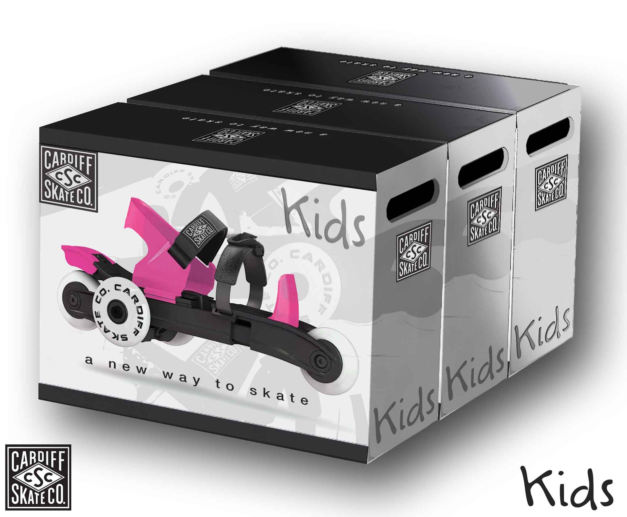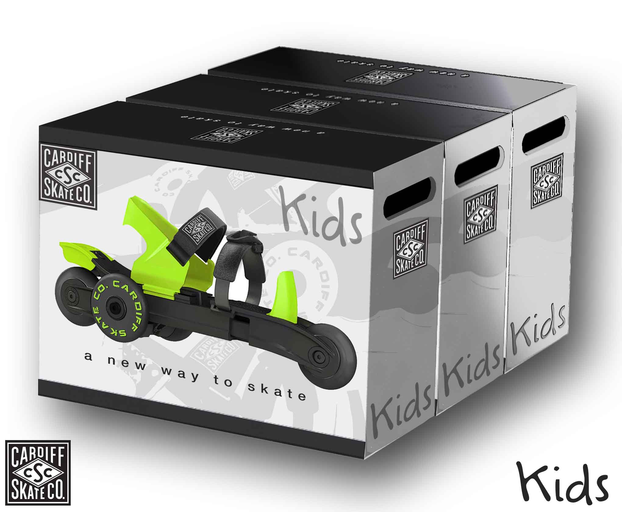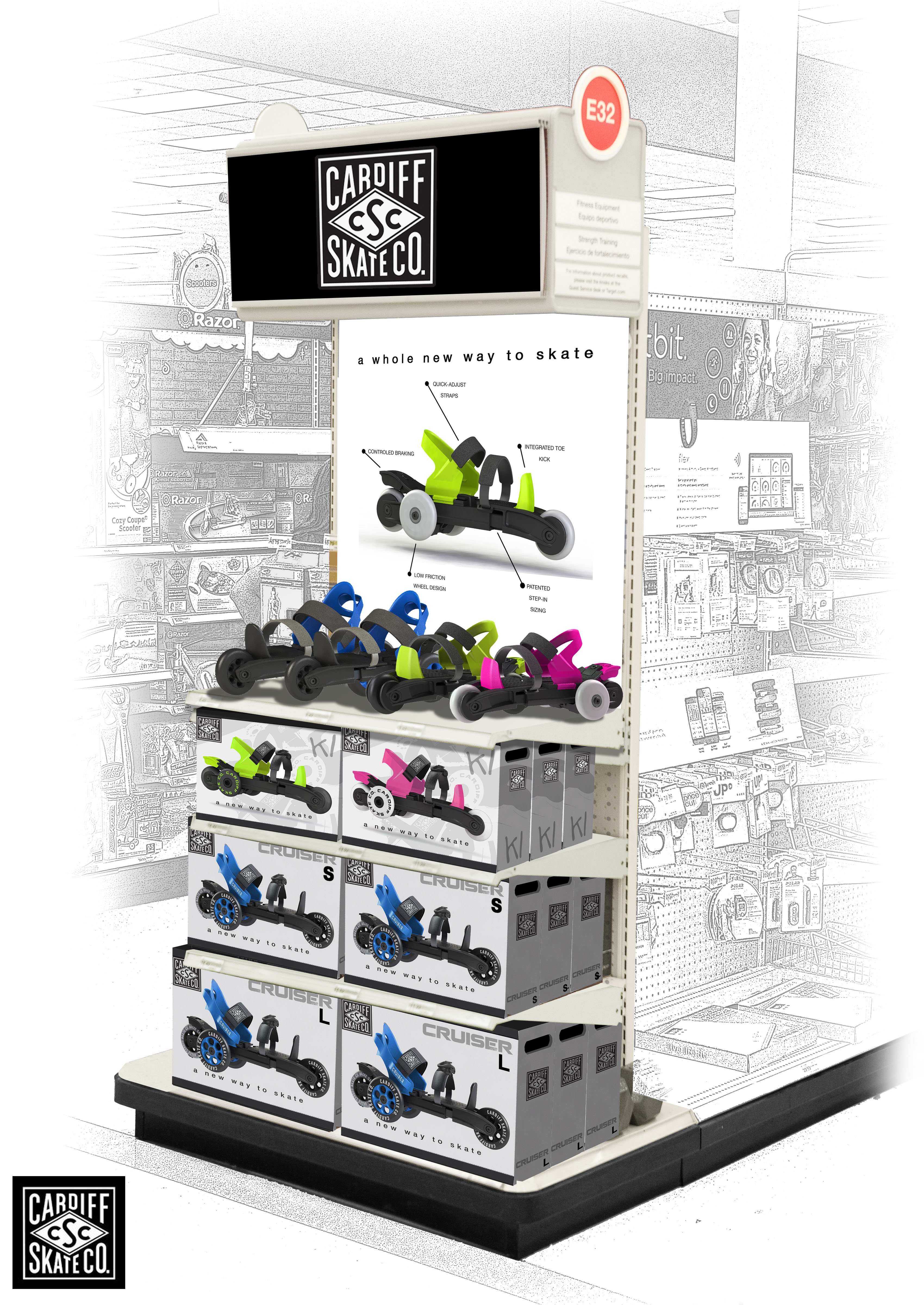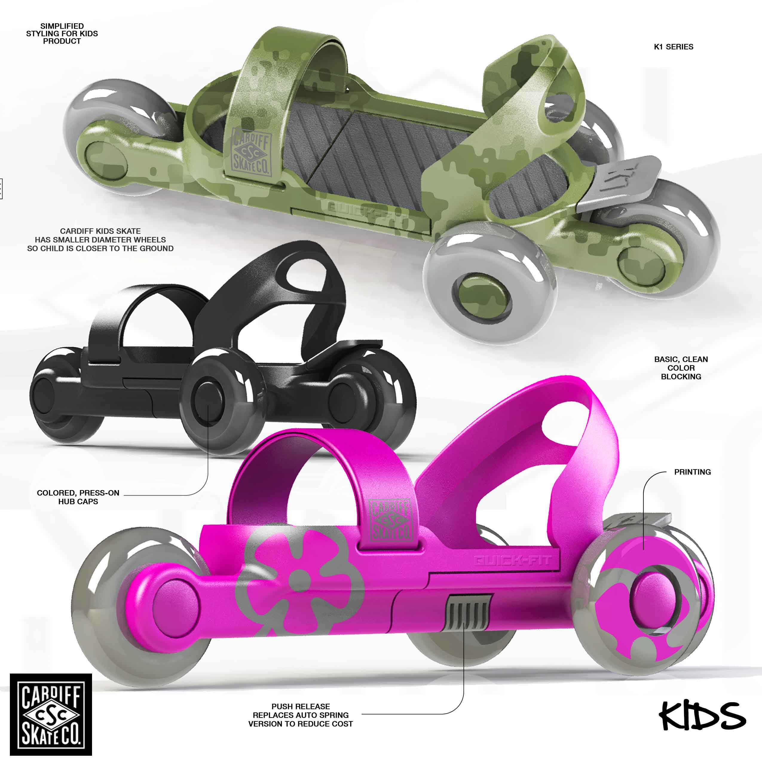 Our history with the Cardiff Skate Company began with the original inventor, Brian Green, of the tri-skate in 2006. Our recent work was an update to the original product line for their adult skates in preperation for a nation-wide launch at Target. During early line-meetings, Faulconer Design made the suggestion to include a NEW product specific for kids and youth as an additional offering. The Cruiser line of products were the end result. Along with the products, themselves, we also created packaging and point-of-purchase display. The project was completed and delivered within a very compressed time frame.